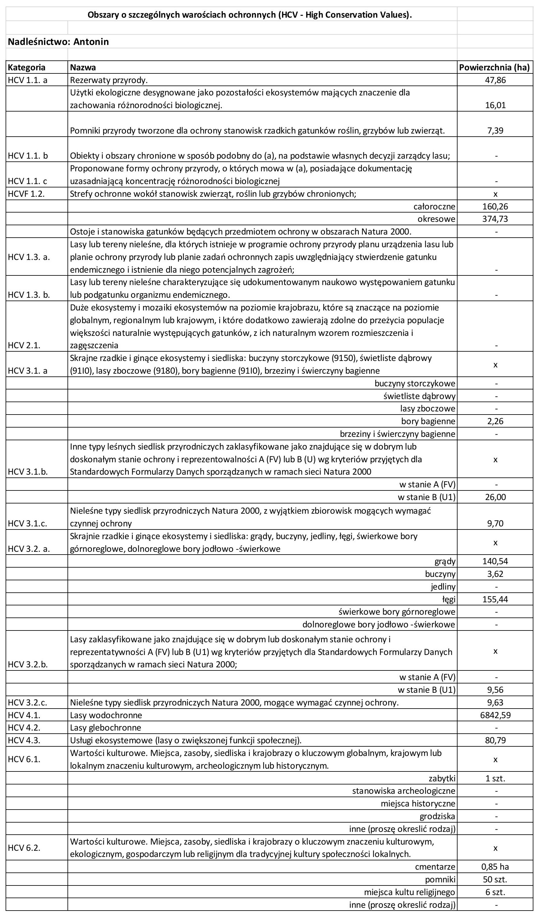 Zgodnie z Przejściowym Standardem Odpowiedzialnej Gospodarki Leśnej FSC dla Polski (FSC-STD-POL-02-2024) Nadleśnictwo Antonin wyznaczyło następujące obszary HCV:
